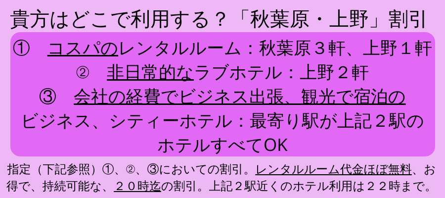 ① 「秋葉原・上野」割引、適用のレンタルルーム・ラブホテル・ビジネスホテル・シティーホテル