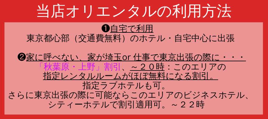 秋葉原・上野エリアのビジネス出張の際のシティーホテル・ビジネスホテルも可。割引は100分1,000円割引、120分以上は2,000円割引。但し、予約(マッサージ・スタート時間)は22時まで、電話予約は21時まで。